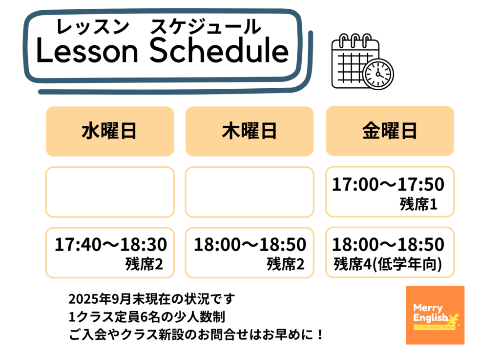 - 場所:Merry English 福間教室 または Miraco古賀